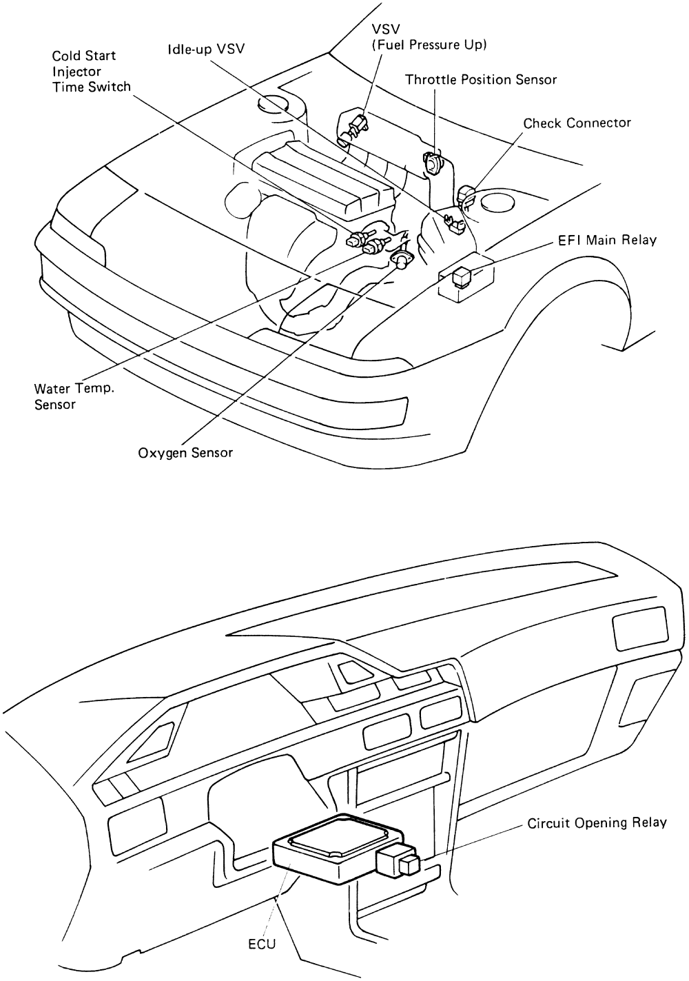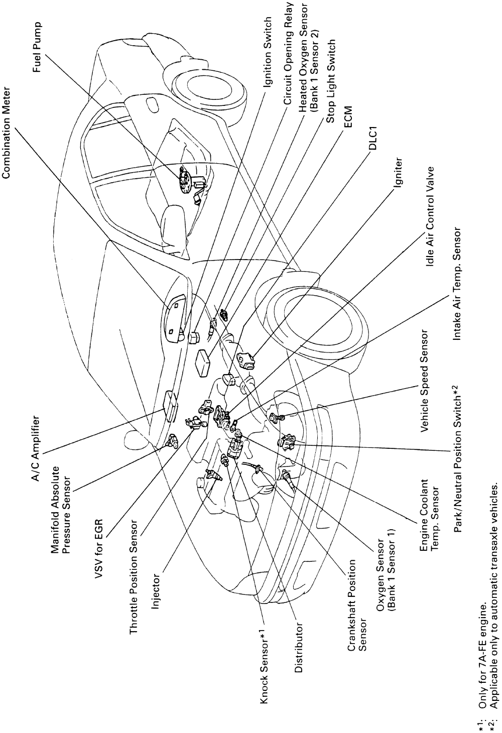 Fig. 3: Electronic engine components-1988-93 4A-FE and 7A-FE engines